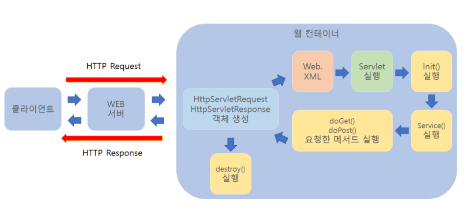 Servlet의 동작과정을 자세히 들여다보면 밑의 그림과 같이 동작한다.