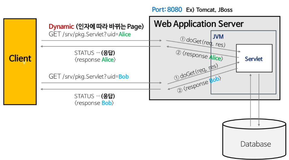 원래 Servlet은 WAS 내에서 실행되다가 Client가 특정 동적인 요청을 던지면 해당 기능을 수행한 후,