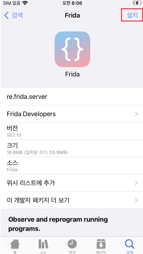 이제 Jailbreak는 끝났으니 진단에 필요한 Frida를 설치해주자!