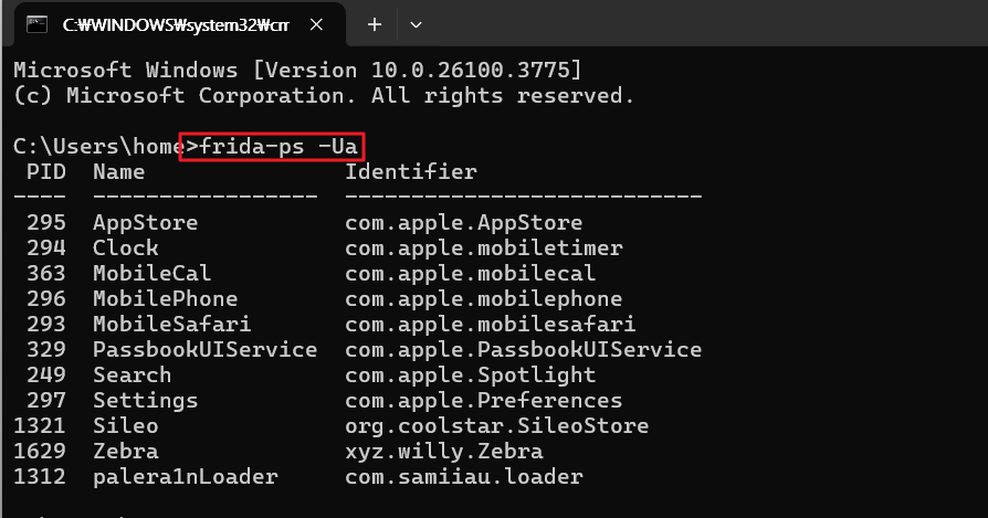 이제 cmd에서 frida-ps -Ua 명령어를 실행해보자