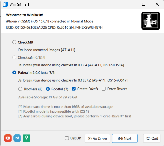 2) 설치했던 WinRa1n을 실행시켜 다음과 같이 Paler1n 2.0.0 beta 7/8의 Rootful과 Create Fakefs를 선택한다.