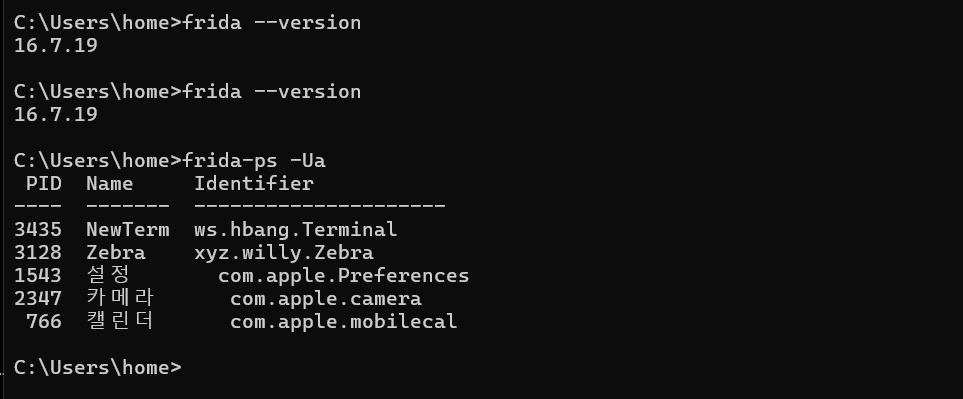 버전 정보가 PC의 frida 버전과 동일하고 process가 정상적으로 동작 중이면 설치가 완료된 것이다.