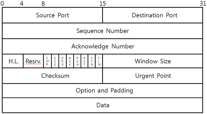 tcp flag를 알려면 tcp header의 구조를 파악해야 해. 다음 그림이 tcp header의 구조다.