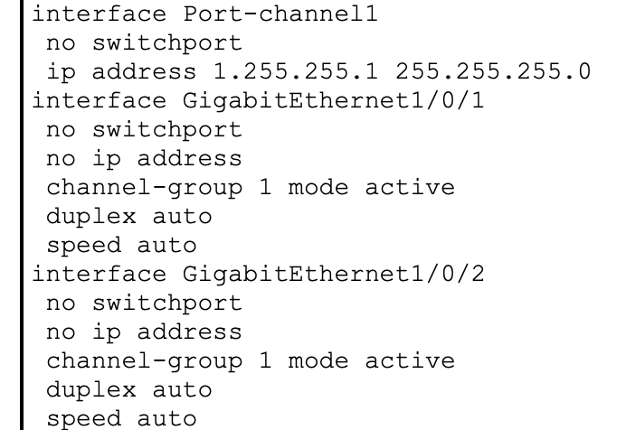 L2 etherchannel과 유사하지만 한 가지 다른 점은 port-channel에 ip를 부여해준다는 거야