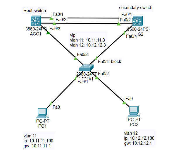 vlan 11은 sw1으로 vlan 12는 sw2로 route를 분산시킬 수 있도록 만들 수 있어