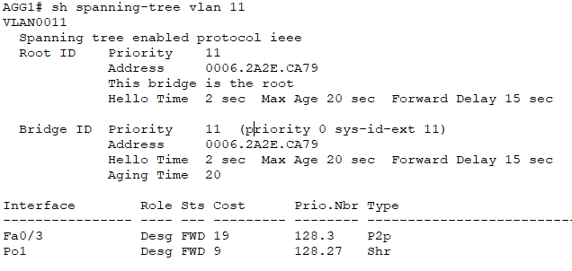 AGG1과 2960 switch에 show spanning-tree vlan 11 명령으로 priority를 확인해보자