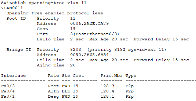 이를 확인할 수 있는 명령이 있는데 바로 show spanning-tree vlan [number]로 확인할 수 있어