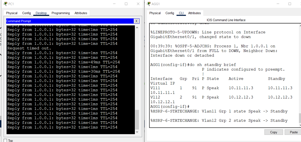 standby priority=100 actvie priority =101로 active(AGG1) 으로 ping이 지나갔지만