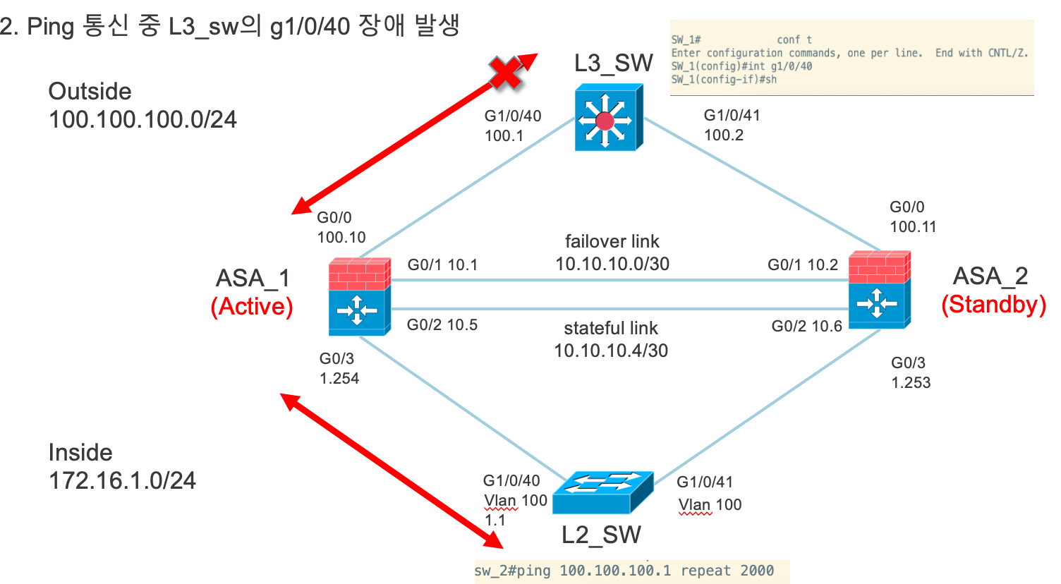 밑에 그림을 보면 L3_SW의 g1/0/40 port가 장애발생시에 active가 standby로 넘어가는지 확인해보고 있어