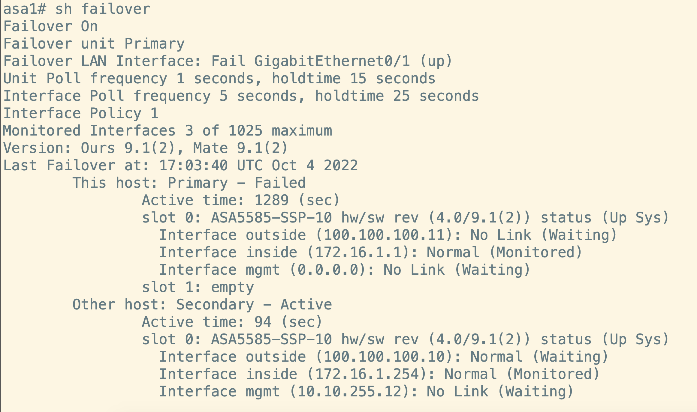 (Failover int ip NAME 192.168.100.1 255.255.255.252 standby 192.168.1.2)