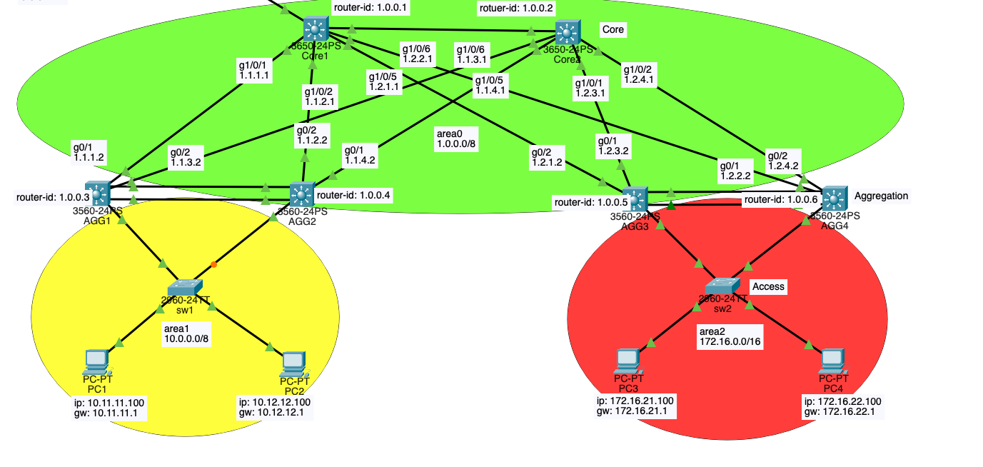 이제 aggregation과 core layer에서 network 구성을 하는데 이 때 사용할 protocol은 OSPF야