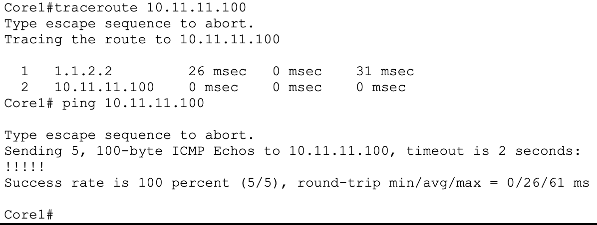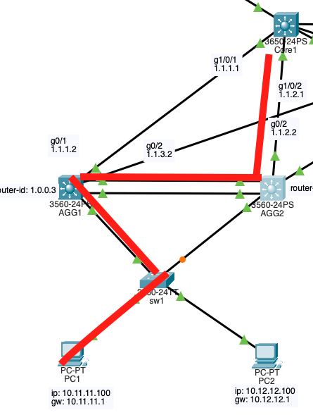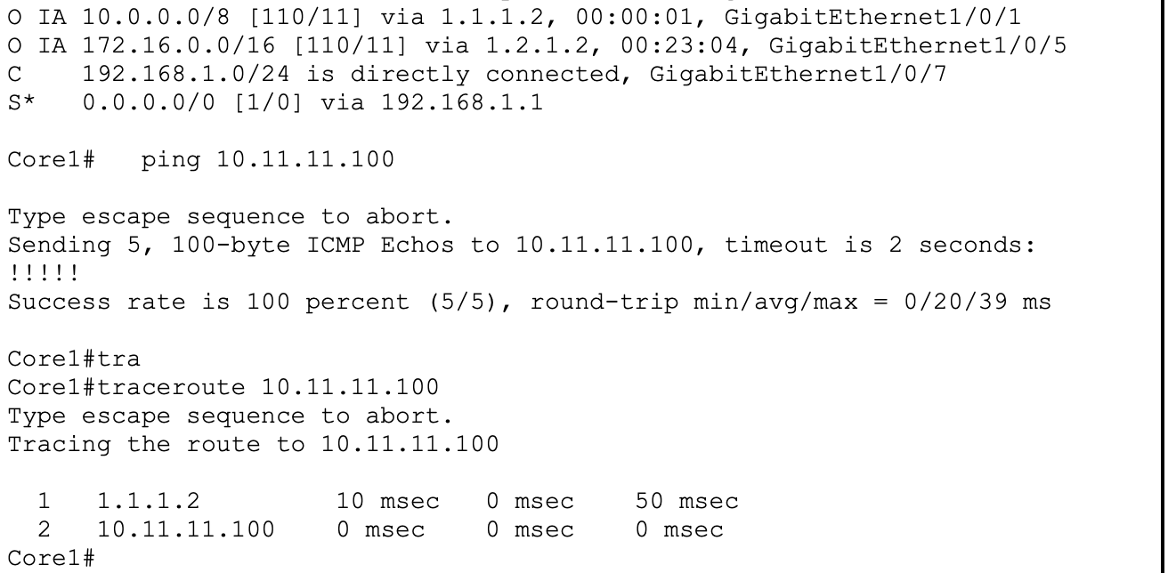 그렇기 때문에 core1 switch에서 routing table에 next-hop 주소로 1.1.1.2가 routing table에 올라가있는 상태야