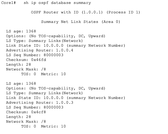 core1 switch에서 sh ip ospf database summary로 LSA type-3 data를 확인해보도록 할께