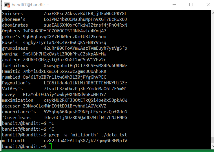 The password for the next level is stored in the file data.txt next to the word millionth