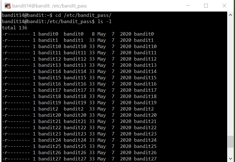 step3. yes로 대답하면 bandit14로 접속이 되고 문제에서 언급한 /etc/bandit_pass/를 찾아본다.
