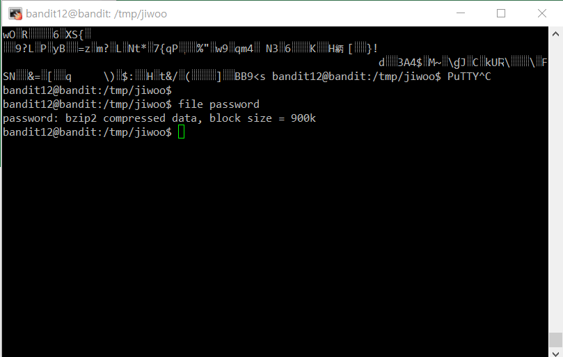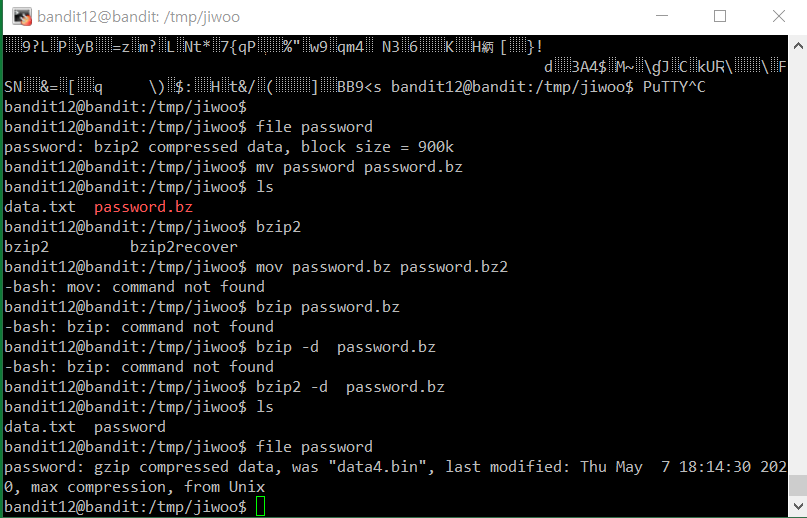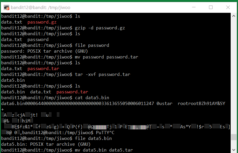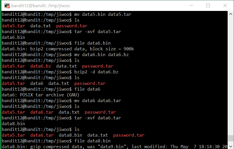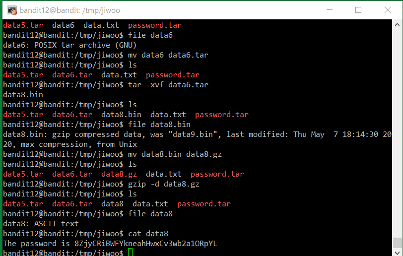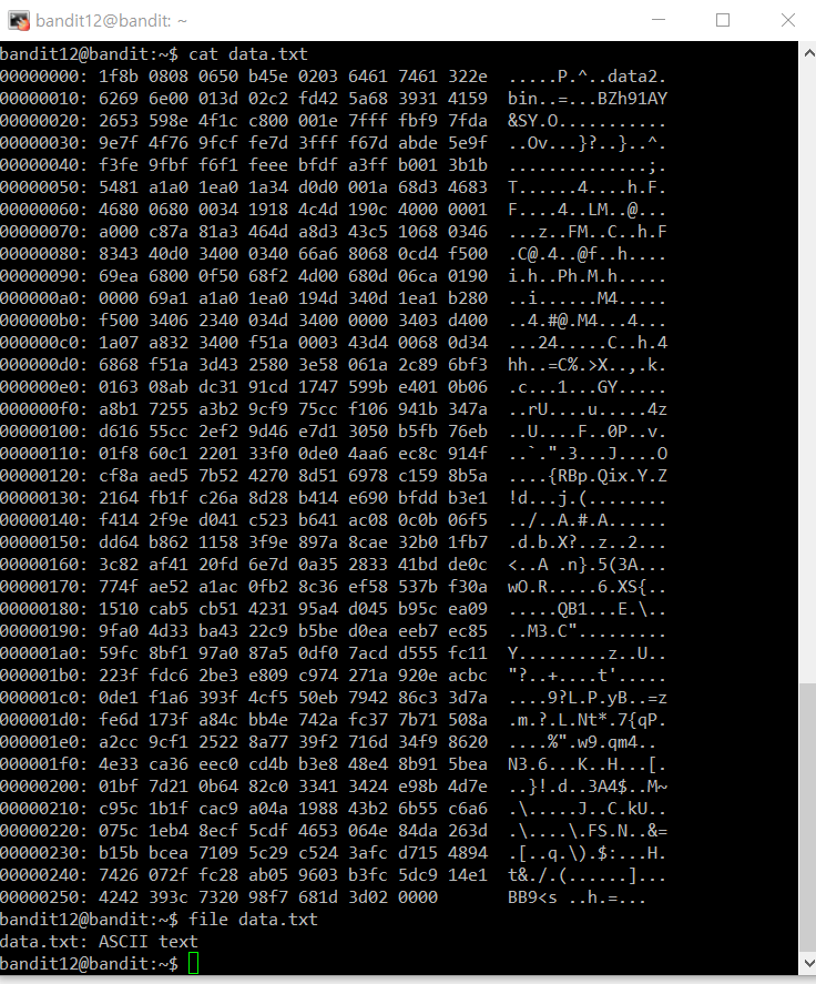 The password for the next level is stored in the file data.txt, which is a hexdump of a file that has been repeatedly compressed. For this level it may be useful to create a directory under /tmp in which you can work using mkdir. For example: mkdir /tmp/myname123. Then copy the datafile using cp, and rename it using mv (read the manpages!)