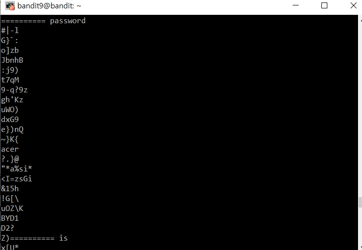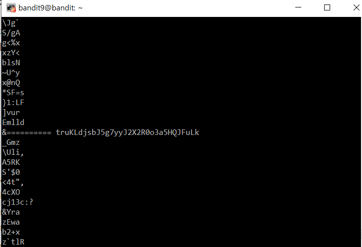 The password for the next level is stored in the file data.txt in one of the few human-readable strings, preceded by several ‘=’ characters.