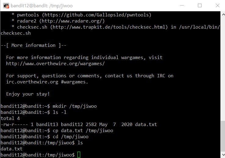 2. /tmp 밑에 문제풀이에 사용할 directory를 생성해보도록 하겠다. 그리고 data.txt 파일을 해당 directory로 옮겨본다.