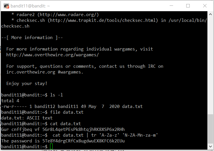 cat data.txt | tr 'A-Za-z' 'N-ZA-Mn-za-m' 명령으로 해당 파일을 읽어낸다.
