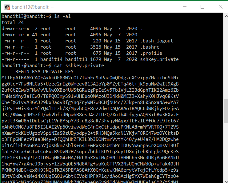 The password for the next level is stored in /etc/bandit_pass/bandit14 and can only be read by user bandit14. For this level, you don’t get the next password, but you get a private SSH key that can be used to log into the next level. Note: localhost is a hostname that refers to the machine you are working on