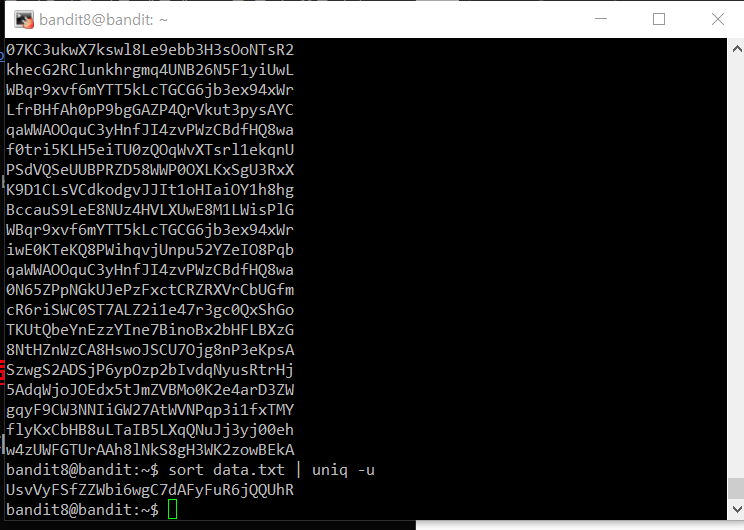 The password for the next level is stored in the file data.txt and is the only line of text that occurs only once