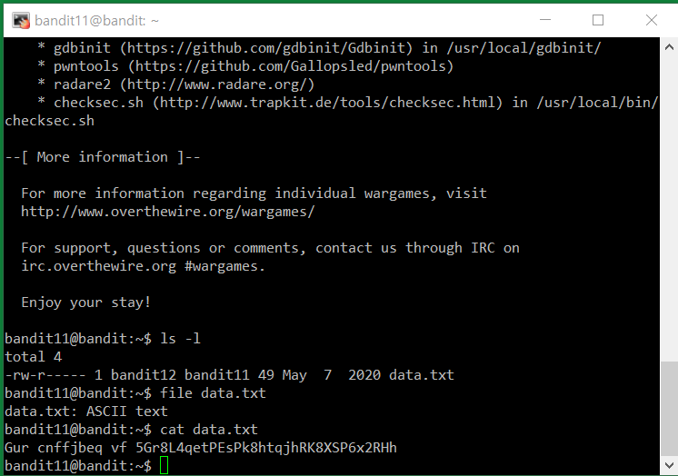 The password for the next level is stored in the file data.txt, where all lowercase (a-z) and uppercase (A-Z) letters have been rotated by 13 positions